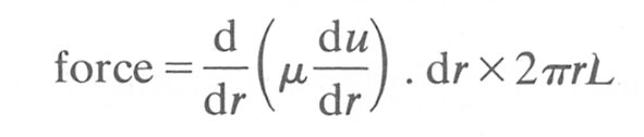The net viscous force acting on the shell will be given by the difference in shear force on the two surfaces of the shell. The shear stress at any radial position is given by (§4.3)