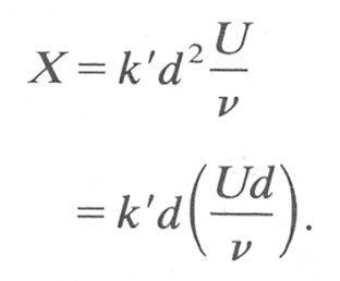 In pipe flow U and d are the representative velocity and dimension of the flow. Therefore we can say that the magnitude or scale of the viscous force will be proportional to the product of viscosity and velocity gradient (= mU/d). Similarly the inertial force is proportional to the kinetic energy per unit volume (rU2) of the flow. The relative importance of the two quantities can then be expressed as the ratio