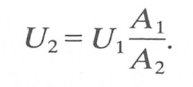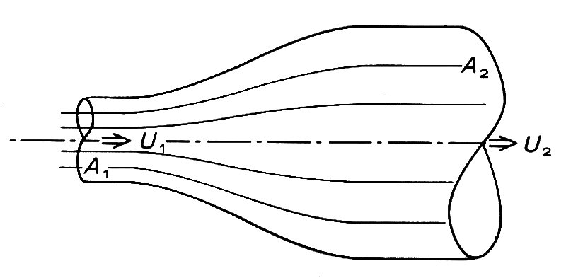 Fig. 5.11. Flow in a circular tube of expanding cross section from area A1 to area A2. Note that the velocity falls from U1 to U2..