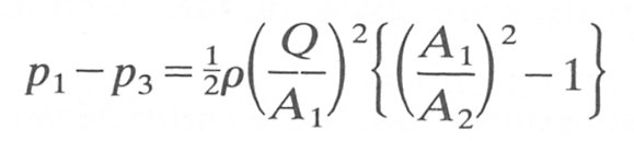 If we assume that there are no frictional losses, then from the above discussion we know that p1 will be greater than p3, but that pressure will rise again downstream till at the end of the divergent section the pressure will have recovered to p2, which should equal p1. However, in reality friction losses cause p2 to be slightly lower than p1, though if the meter is well designed, they will be small and may be ignored. The volume flow-rate Q may be calculated as follows. It is very important to note here that in this example we are not talking about the mass flow-rate but the volume flow-rate. If we confused the two we would derive inhomogeneous equations with inconsistency in the units. Using Equation (5.12) for an energy balance across the convergent section we have