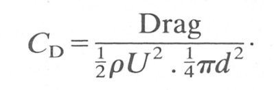 We have concentrated so far on two-dimensional bodies because the flow patterns past them are easy to visualise. However, in many everyday examples of flow past bodies the body, and the flow round it, is three-dimensional. In fact the main features of the flow past three-dimensional bodies are similar to those already described, but it is important to recognise the few differences. The three-dimensional body most commonly studied is the sphere; this is because the flow past it is both more convenient to produce experimentally and more tractable to analyse theoretically than any other. Furthermore, many everyday examples of approximately spherical bodies come to mind: a large balloon rising through the air (large Re), a small grain of sand settling in water (small Re), a ball-bearing in oil (small Re), a ball in air (quite large Re), etc. In this case, the Reynolds number is again defined in terms of its diameter d and velocity U relative to the fluid far away, together with the kinematic viscosity (n) (i.e. Re = Ud/n). The drag coefficient is again the total drag divided by a typical dynamic pressure force, which for a three-dimensional body is usually taken to be 1/2rU2 times the area presented to the flow (1/4pd2 in the case of a sphere). Thus: