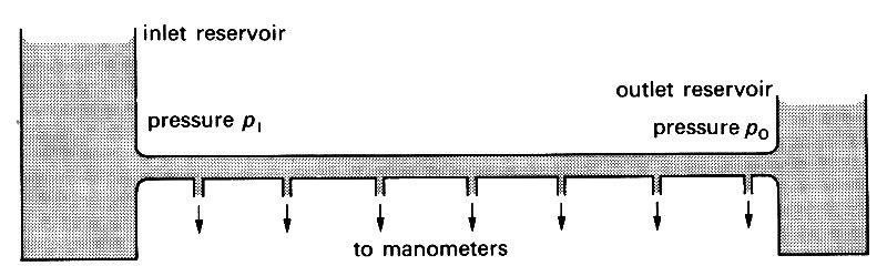 Its entrance and exit are connected to large reservoirs so that the pressure drop between the ends of the tube may be maintained constant and a steady flow of water through the pipe achieved. Small side hole, or lateral, pressure tappings are made in the pipe at frequent intervals along its length and these tappings are connected to a series of manometers. It is thus possible to measure the pressure drop per unit length or pressure gradient along the pipe.