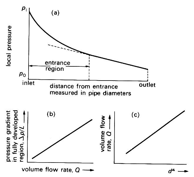 Fig. 5.2. (a) The variation in local lateral pressure with distance down the tube. Initially, in the entrance region, the pressure falls rapidly with distance but far from the entrance the pressure falls linearly with distance, (b) The linear variation of the pressure gradient (Ap/L) in the region remote from the entrance as a function o{ the volume flow-rate Q through the tube. (c) The linear increase in flow-rate Q with increasing pipe diameter to the fourth power d4 at a constant applied pressure gradient in the region remote from the entrance.