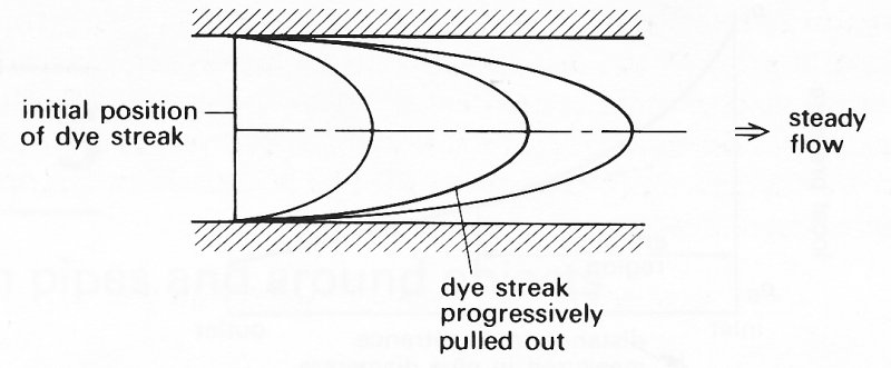 as the flow proceeds downstream, this filament will be transported with it and will become stretched out as shown. Each small elemental length of the streak will be transported downstream at the rate of the local fluid velocity. Thus if we record the position of the dye streak at various times after injection, it is possible to compute the velocity profile. It is possible also to introduce small blobs or fluid packets of marker dye at various radial distances from the axis and to watch their movement in a similar manner. Each isolated element will be seen to move with the local fluid velocity as before. It will also be noticed that as it is transported the packet will retain the same radial position; it will not drift towards the axis or wall nor will it corkscrew or spiral down the tube. This indicates that the flow is unidirectional or axial. It is also symmetrical, that is, the flow at any given radial distance from the axis is the same no matter which radial ray we look at. This is called axisymmetric flow. As will be confirmed below theoretically, the velocity profile is in practice parabolic in shape with the maximum velocity along the axis, the velocity reducing progressively to zero at the wall.