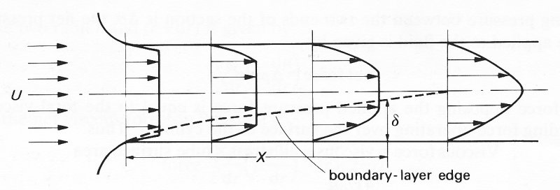We will now consider the rate at which the boundary layer grows with distance along the pipe; it depends upon the balance between the inertial forces and the viscous drag forces in the region of the wall.