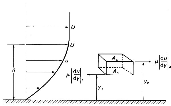 The tangential or shear stress on surface A1 (area A) is m|du/dy|1. Similarly the shear stress on A2, (also area A) is m|du/dy|2 . These two stresses will be slightly different in magnitude because of the change in velocity gradient in the region (see Fig. 4.7). The net viscous force on the element will thus be given by the change in stress with distance y from the wall:
