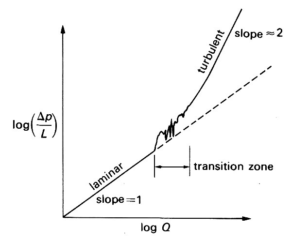 Fig. 5.7. The variation of volume flow-rate Q with pressure gradient Dp/L, plotted on a logarithmic scale, for steady flow in a long tube to indicate the changing relationship as the flow-rate is increased.