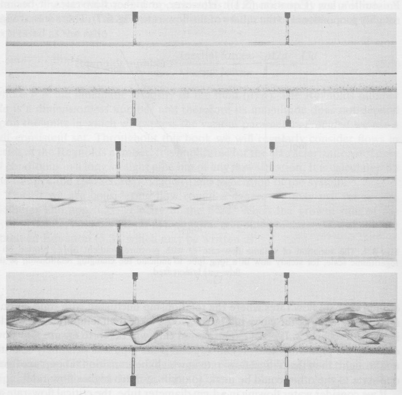 Fig. 5.8. The motion of a filament of dye in a long straight tube. Upper panel: the steady axial motion of a dye streak in a flow at low Re. Middle panel: At Re just greater than the critical value the steady laminar motion of the dye ceases and short bursts of turbulence can be observed. Bottom panel: At higher Re the flow becomes fully turbulent and random motion of the dye streak occurs.
