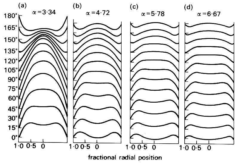A very useful dimensionless parameter is the Womersley number a, which indicates the extent to which the velocity profile in laminar flow in a long pipe differs from the Poiseuille profile when the fluid is subjected to a sinusoidally varying pressure gradient of angular frequency w: