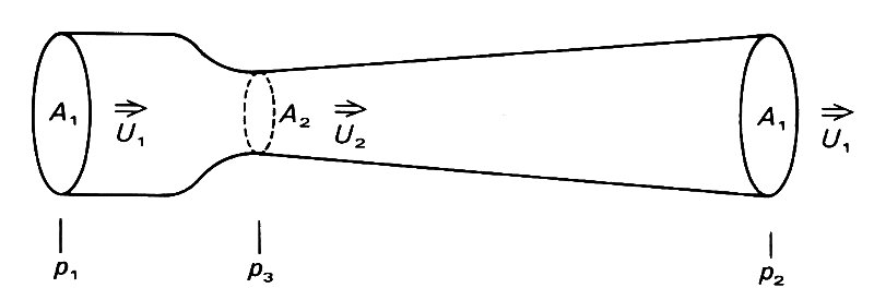 Fig. 5.12. Flow in a Venturi section where initially the tube cross-sectional area is decreased from 'A1 to A2, and then slowly re-expands to area A1. The pressure measurements p1, p3, and p2 are made upstream of the constriction, at its maximum and far downstream respectively.