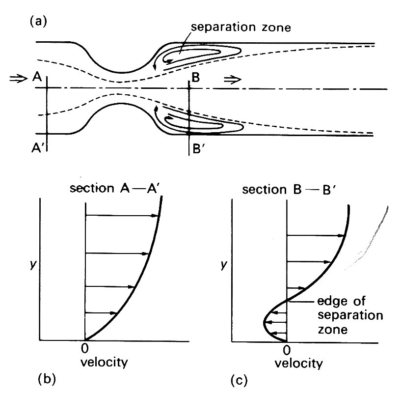 Fig. 5.13. Flow through a constriction followed by a rapid expansion downstream showing the region of flow separation (a). The sections at A-A' (b) and B-B' (c) show the velocity profiles at those stations. At the upstream station the flow is everywhere in the forward direction; at the downstream station fluid near the wall has motion in the reverse direction.