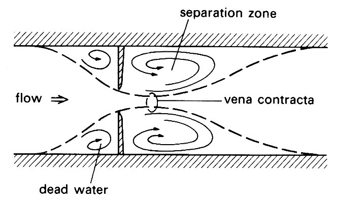 considering first steady laminar flow of a real fluid. As the flow approaches the constriction, the streamlines become bent and the flow accelerates. The fluid velocity in regions near the pipe wall and orifice is extremely low and these regions are effectively 'dead water' zones. As the flow passes through the orifice the jet continues to contract for a short distance further downstream till it reaches the 'vena contracta' where the effective cross-sectional area for flow is a minimum. Thereafter the flow diverges and ultimately fills the tube cross-section again. Immediately downstream of the orifice a separation zone can always be observed. It is characterized by a recirculating vortex-like motion. This results from the extremely rapid increase in cross-section immediately downstream of the orifice which produces a very large adverse pressure gradient for the flow. The flow emerging from the orifice does so effectively as a jet and the rate at which the boundary of the jet expands is relatively slow; as a result the separation zone extends some distance downstream.