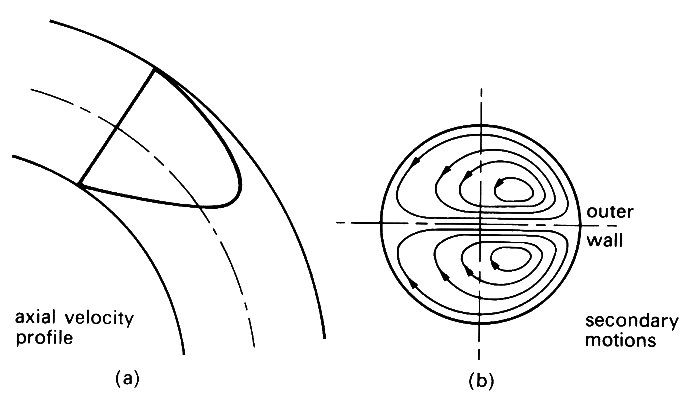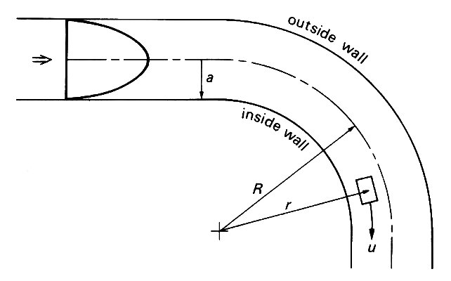 is a constant along each streamline; as usual, p, r, u are the fluid density, pressure, and velocity respectively. Furthermore, because each streamline originates from a region where p and u are uniform, the constant has the same value on every streamline. Now, although no secondary motions are set up in the core in this region, because all fluid elements have approximately the same velocity, there must still be a sideways pressure gradient for the fluid to be forced round the bend. Hence p is greater at the outside of the bend than at the inside, and so for H to remain uniform, the fluid velocity u must be smaller at the outside than at the inside.