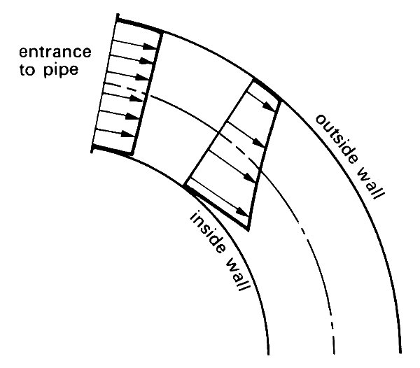 When fluid enters a curved tube, a thin boundary layer is present on the wall as in a straight tube. In this case, however, the velocity profile in the core, where viscosity is unimportant, is not approximately flat, even if it is flat at the entrance itself. It is observed in experiments that the velocity of the fluid near the inside wall is greater than that near the outside wall (Fig. 5.17).
