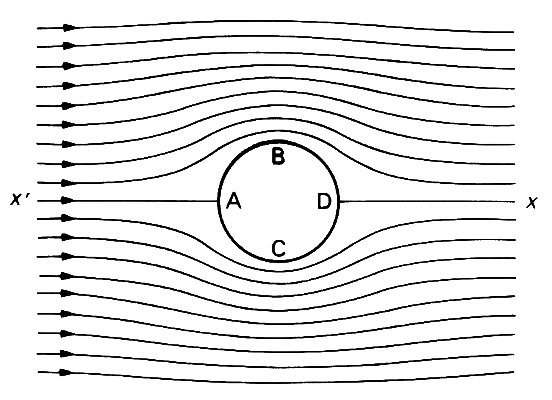 Fig. 5.18. A plane perpendicular to the cylinder axis, showing the streamlines (particle paths) for steady flow of an inviscid fluid past the cylinder. The velocity far from the cylinder is uniform, and everywhere parallel to the line x'x. A and D are stagnation points; B and C are points where, in the absence of viscosity, the fluid speed is greatest.
