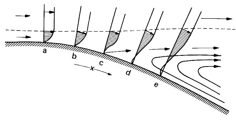 Fig. 5.20. Diagram showing the velocity profiles across the boundary layer, at different positions along the body surface. Note the region of reversed flow downstream of the point c of boundary layer separation.