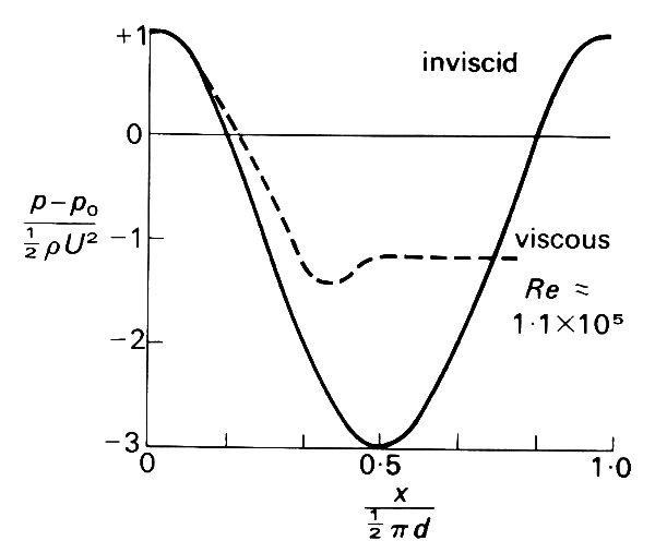Fig. 5.21. Graphs of the pressure exerted on the cylinder, plotted against distance x from the front stagnation point, measured along the cylinder surface. The broken curve was measured when Re = 1.1 x 105, while the solid curve is the theoretical curve for an inviscid fluid. It is the difference between these pressures at the back of the cylinder that is responsible for most of the drag. (From Batchelor (1967). An introduction to fluid dynamics, p. 340. Cambridge University Press.)