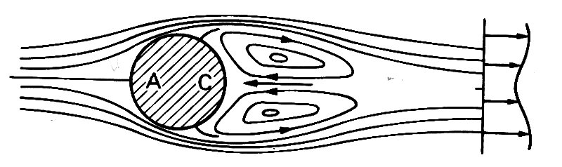 Fig. 5.22. Diagram showing the recirculating eddies behind a circular cyclinder, and a velocity profile across the viscous wake downstream. A and C are stagnation points.