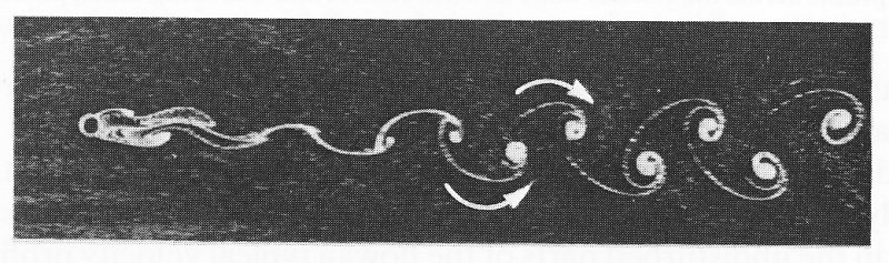 The frequency f with which vortices are shed behind a cylinder can be related only to the parameters which determine the flow pattern: that is, the velocity U, diameter d, viscosity m, and density r. A simple quantity with the dimensions of frequency which can be derived from these is U/d, although more complicated quantities can be constructed by multiplying this by anything else which depends only on the dimensionless Reynolds number (Re = rUd/m). We may conclude, however, that the dimensionless quantity fd/U can depend only on Re, for a given shape of body. In fact this quantity, called the Strouhal Number, is approximately constant (0.2 for a circular cylinder) for a wide range of Reynolds numbers, above approximately 103, the Strouhal number is effectively constant. Over this range, the frequency of vortex shedding from a given body, and hence the pitch of the sound produced, increases in proportion with the flow velocity. The noise of the wind becomes more highly pitched as its speed increases.