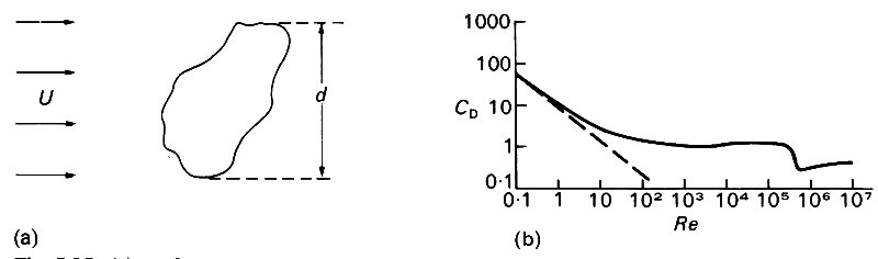 Fig. 5.25. (a) Definition of the diameter d of a cylinder of non-circular cross-section, for use in Equation (5.16), which determines the drag coefficient CD. (b) Graph of CD against Re for a circulary cylinder (logarithmic scales). The broken curve is the theoretical curve for small values of Re (accurate up to Re = 0.2). CD is approximately constant for values of Re between 200 and 200,000. (After Fox and McDonald (1973). Introduction to fluid mechanics, p. 408. John Wiley, New York.)
