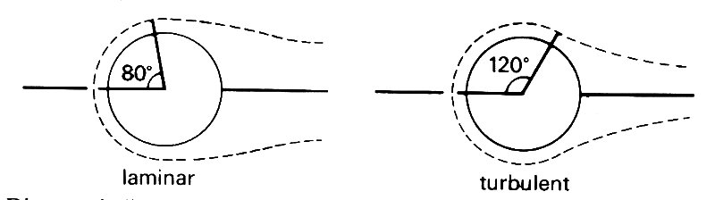 Fig. 5.26. Diagram indicating the extent to which turbulence in the boundary layer inhibits boundary layer separation, thus reducing the drag on the body.