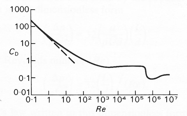 Fig. 5.27. Graph of CD against Re for a sphere; it is qualitatively similar to that for a cylinder. The broken curve is again the theoretical result for small values of Re. (After Fox and McDonald (1973). Introduction to fluid mechanics, p. 406. John Wiley, New York.)