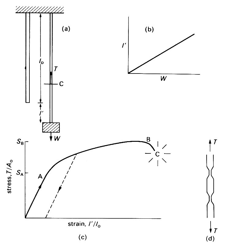 (c) The results of a complete wire-stretching experiment, expressed in the form of a graph of stress (= T/A0, where A0 is the initial cross-sectional area of the wire) against strain (=l'/l0). For stresses less than SA the two are directly proportional. For greater stresses, plastic flow takes place, which means that the strain does not reduce to zero when the stress is reduced to zero (dotted curve). Once the maximum applied stress SB has been reached, flow continues even when the stress is reduced below SB. Fracture occurs at C.
