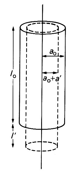 In the wire-stretching experiment already described, most materials experience a lateral contraction simultaneously with the longitudinal extension. For example, if the wire were circular, with undeformed radius a0, then, after stretching, its radius may be a0 + a', where a' is usually negative (Fig. 7.2; we keep to the convention of describing a contraction in length as a negative extension).