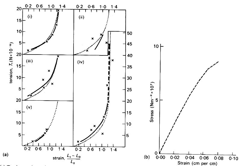 Fig. 7.4. (a).Tension-strain graphs of five fresh elastin fibres in Ringer-Locke solution at 37 oC. The measured points (x) are compared for each fibre with the individual regression curve (solid black) and the common regression curve (stippled). Ordinate: tension per fibre. Abscissa: strain (From Carton, Dainauskas, and Clark (1962). Elastic properties of single elastic fibres', p. 549, J. appl. Physiol. 17.)