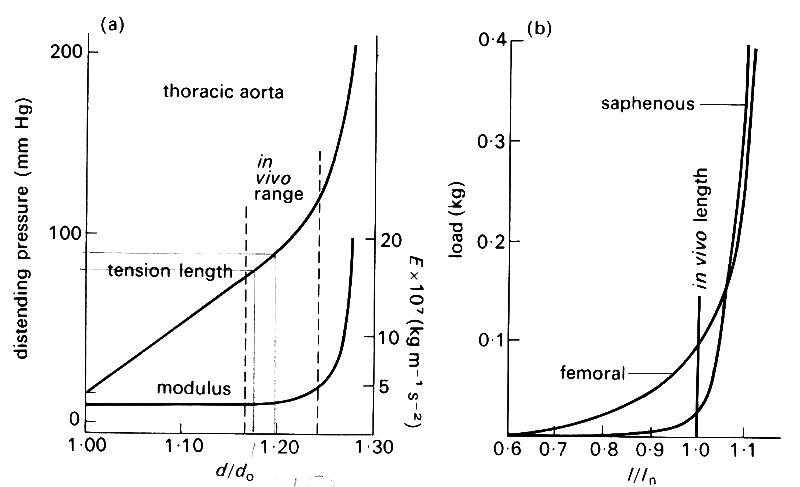 The reason for the rapid increase in stiffness of blood vessel walls as their distension increases is thought to be associated with the different arrangement of collagen and elastin fibres within them. At low strains, most of the collagen fibres are slack, and not straight; all the stress is then borne by the elastin fibres. As the strain increases, the collagen fibres straighten out, and increasingly take up the stress. Since these are much stiffer than the elastin fibres (Figs. 7.4 (a) and (b)), the wall therefore becomes much stiffer. The situation is analogous to that of a balloon being blown up inside a string bag. It is relatively easy to start with, but extremely difficult once the bag is taut.