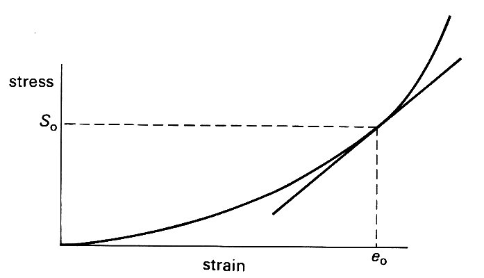 and the strain has a corresponding value eo. Then for small departures from this state, the stress-strain curve can be approximately represented by the straight line tangent to it at the point where stress equals So, and the small deformations can be analyzed in terms of a Young's modulus given by the slope of this tangent. The stress-strain curve is then said to have been linearized (see Chapter 8, §8.5). For example, let us consider a longitudinal stretching experiment in which small deformations take place about an initially stressed state with tension, length and cross-sectional area of the specimen equal respectively to T1, l1, A1. Equation (7.1) can still be used to determine an effective Young's modulus E if in its place we write