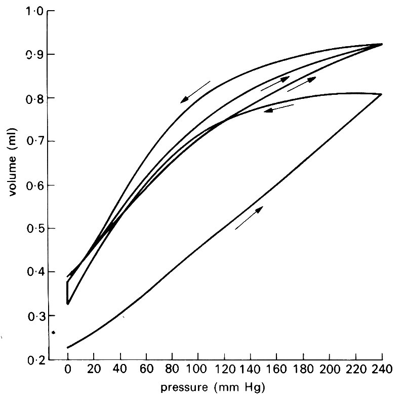 Fig. 7.7. Three consecutive pressure-volume curves of a femoral artery. The sequence of inflation and deflation is shown by the arrows (the last two deflations followed the same course). The vessel appears to become rather less distensible during the series of inflations. (From Bergel (1961). The static elastic properties of the arterial wall, p. 451. J. Physiol. 156.)