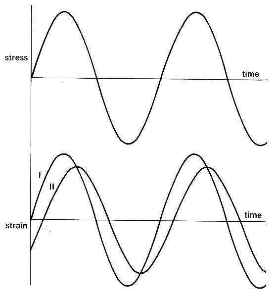 Fig. 7.8. When a cyclically varying stress is applied to a material, the resulting strain stays in phase if the material is purely elastic (curve I). However, if it has visco-elastic properties, the strain lags behind the stress, and varies with a smaller amplitude than if it were purely elastic (curve II).