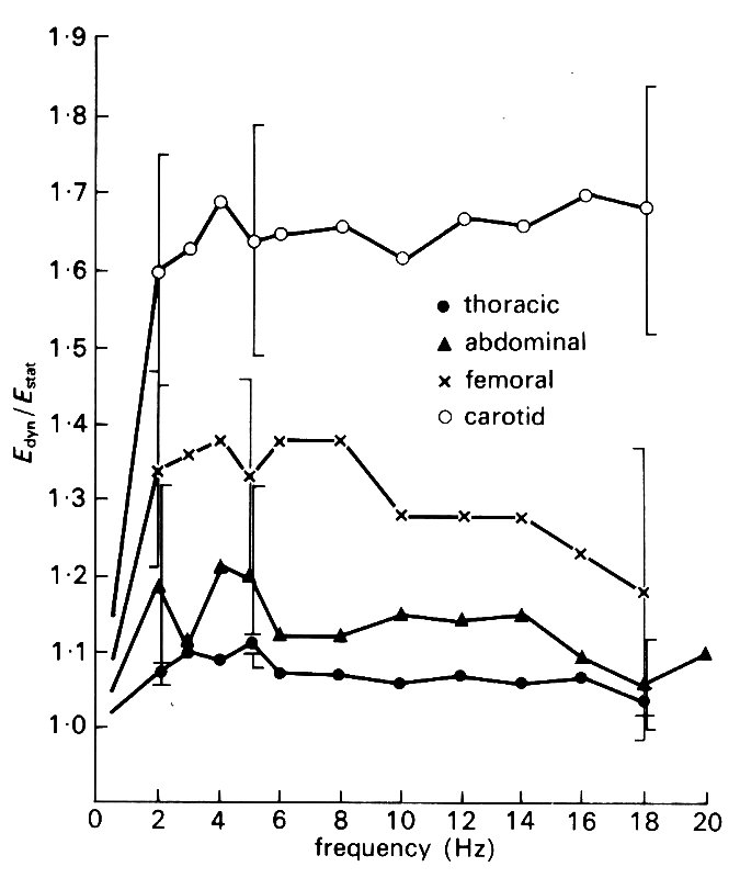 It is found that Edyn is usually greater than the value of E measured in static experiments. For frequencies below about 2 Hz (i.e. for w/2p less than 2 s-1), Edyn varies with frequency, approaching the static value as the frequency approaches zero. It is approximately constant for frequencies between 2 Hz and 20 Hz, and exceeds the static value by a ratio which varies from about 1.1 in the thoracic aorta of a dog to about 1.8 in the carotid artery. The viscous component h w also varies with frequency, but for frequencies above 5 Hz, the quantity h w is approximately constant and takes a value between 0.1 and 0.2 times Edyn The value of h w tends to be greater for smaller, more muscular arteries, which are therefore more visco-elastic.