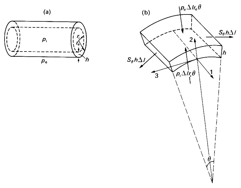 Fig. 7.10. (a) Sketch of a thick-walled tube, with internal and external radii ri and re respectively; wall thickness h = re - ri; internal and external pressures pi and pe.
