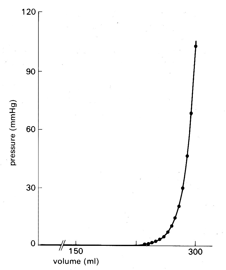Fig. 11.3. Pressure-volume curve of pericardium of dog. (From Holt (1971). Circulation Res. 8, 1171. By permission of the American Heart Association, Inc.)