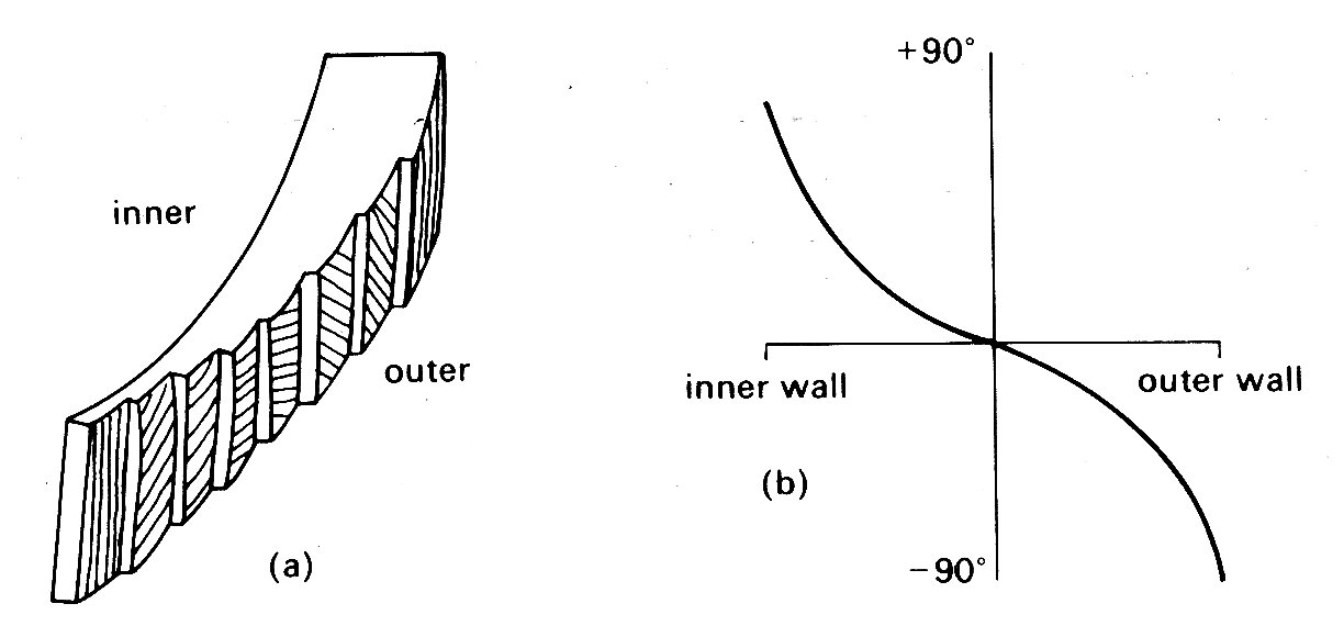 The innermost (endocardial) fibres run predominantly longitudinally from the fibrous region around the valves (the base) to the other end of the roughly elliptical chamber (the apex); the fibres slightly further out into the wall lie at a slight angle to the axis of the chamber, so that the fibres spiral slightly as they run towards the apex. This angulation increases in successively deeper fibres so that those approximately half-way through the wall run parallel to the shorter axis of the chamber, i.e. circumferentially; thereafter the angulation continues, so that the fibres at the outside (epicardial) surface are once again longitudinal. This arrangement gives the ventricle great strength even though individual muscle fibres can only bear tension axially, since a stress applied to the wall in outer wall any direction can be resisted by at least a proportion of the muscle fibres, and there is no direction or plane of weakness. Note that fibres do not have to terminate at the apex; they can turn and spiral back towards the base like string wound spirally on a stick. As can be inferred from Fig. 11.4 (b), there is a great preponderance of fibres with a circumferential distribution.