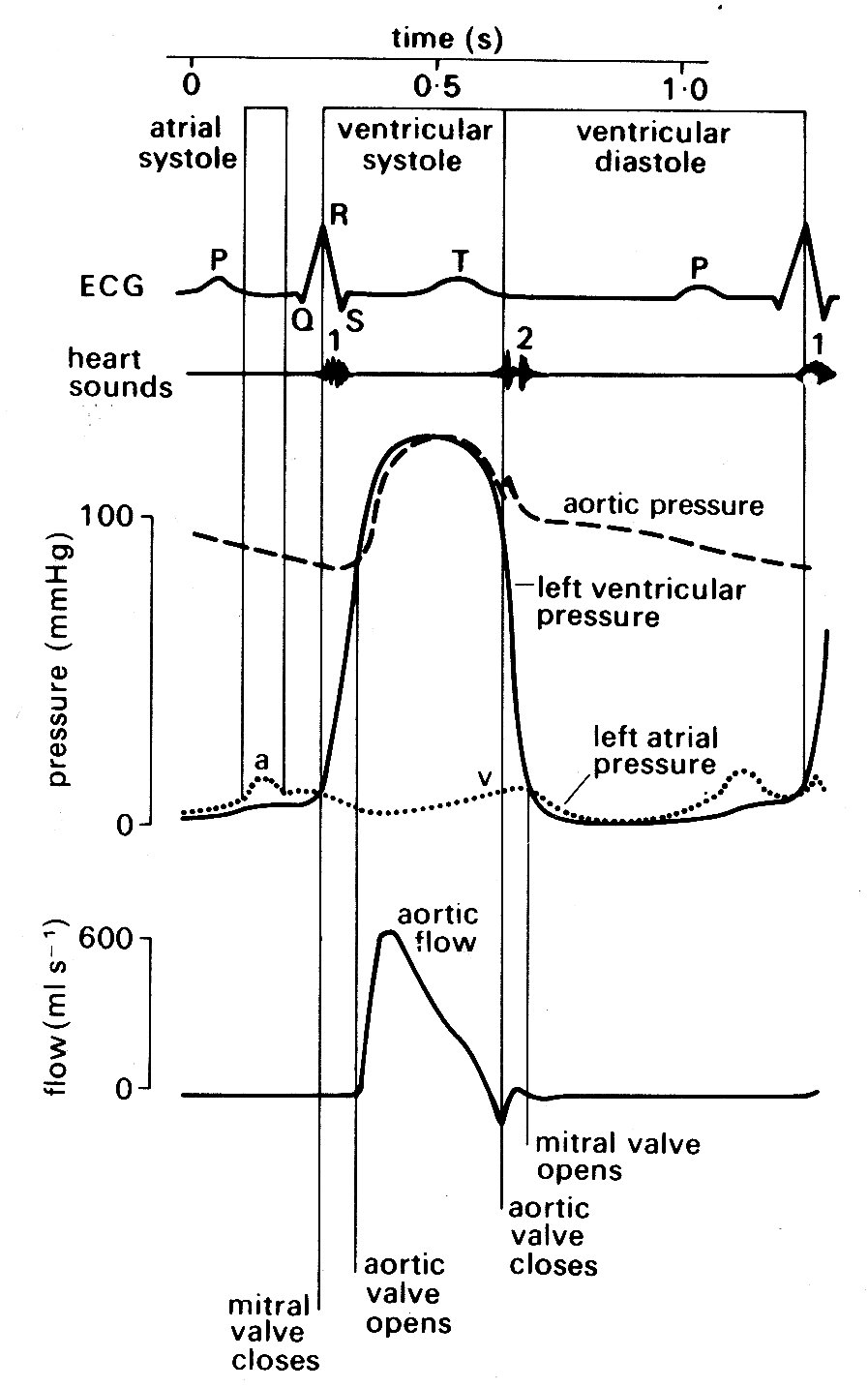 Depolarization of the atria produces a small deflection known as the T' wave; this is followed after a delay of about 0.2 s by a larger voltage deflection, often multiphasic, known as the 'QRS complex'. This reflects depolarization of the two ventricles, and is followed by a final component, the T' wave, which is generated during repolarization of the ventricles. The time relationships between these summed electrical potentials and the mechanical events on the left side of the heart can be deduced from Fig. 11.5, which shows the pressure and flow events that take place at a number of locations in the left side of the heart during a complete cardiac cycle.