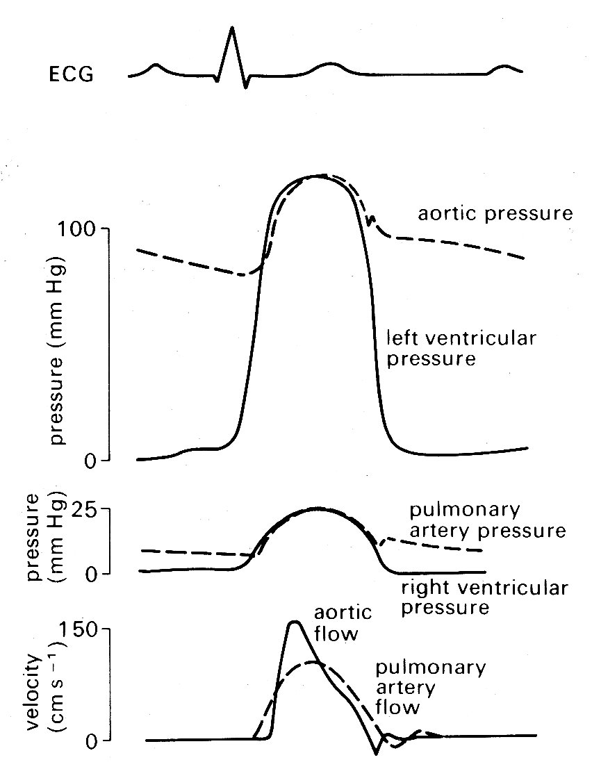 Mechanical events. As has just been mentioned, the onset of ventricular contraction (ventricular muscle depolarization) is signalled electrically by the QRS complex of the electrocardiogram. Both ventricles contract almost synchronously (see Fig. 11.6),