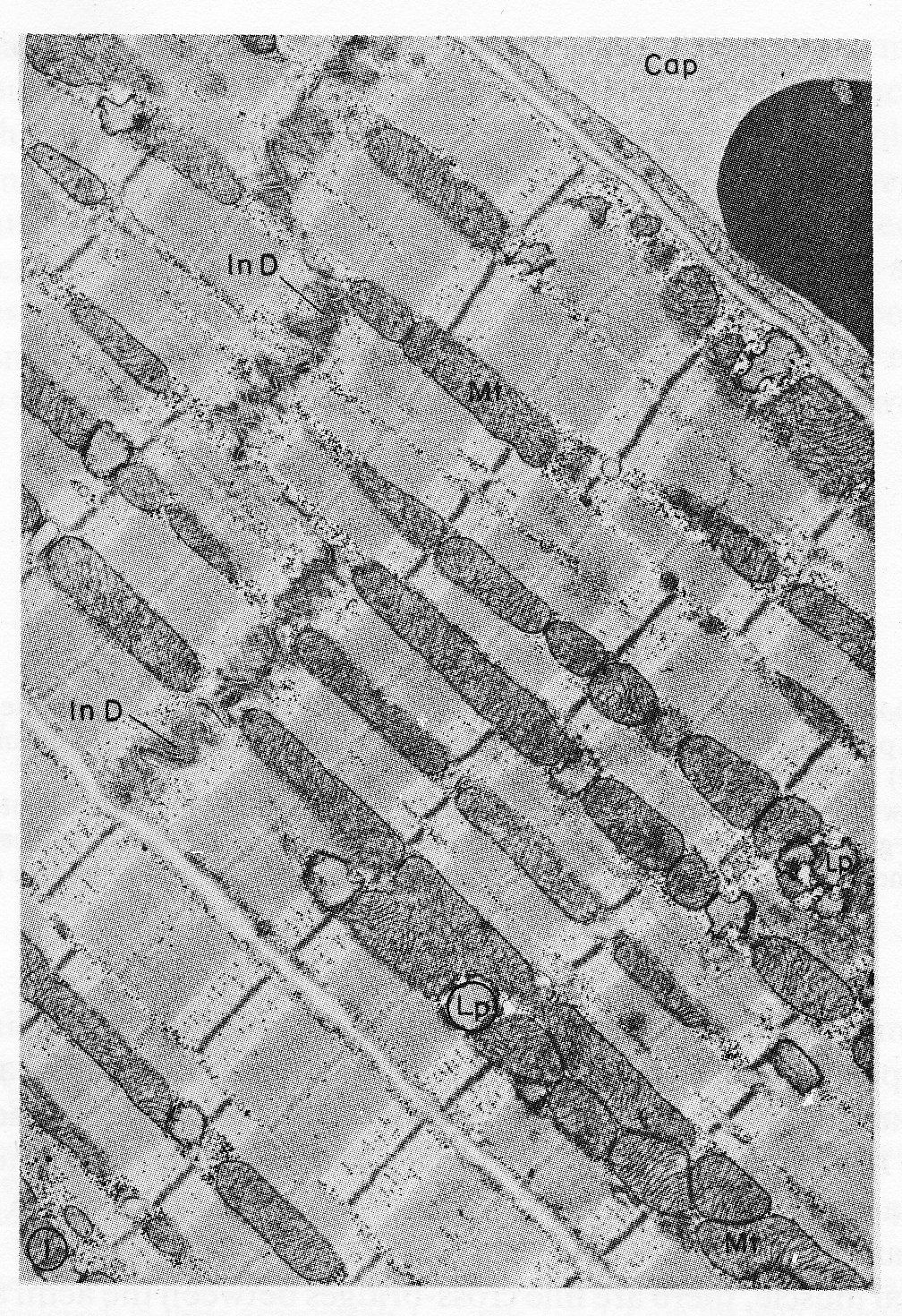 Fig. 11.7. Electron micrograph of parts of three cardiac muscle fibres and an adjacent capillary (Cap) in longitudinal section. The two upper cells are joined end to end by a typical steplike intercalated disc (In D). Rows of mitochondria (Mt) appear to divide the contractile substance into myofibril-like units but, unlike the true myofibrils of skeletal muscle, these branch and rejoin and are quite variable in width. Lipid droplets (Lp) somewhat distorted in specimen preparation are found between the ends of the mitochondria. xl5,000. The structure of a single sarcomere is shown at higher magnification in Fig. 11.8. (From Fawcett and McNutt (1969). 'The ultrastructure of the cat myocardium'. J. Cell Biol. 42, 1-45.)