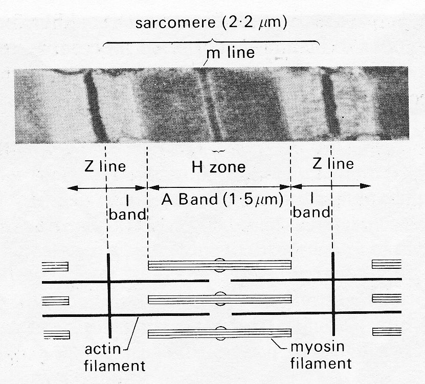 The thicker filaments making up the A bands are composed primarily of the protein myosin; the thinner rods which interdigitate with them are actin. When the muscle is stretched, the Z bands move apart and the actin rods slide along and partially disengage from the myosin rods; thus the I bands widen. When the muscle contracts, the reverse happens, until at very short muscle-lengths the I bands disappear, and new dark bands ('contraction bands') appear where the actin rod tips overlap each other at the centre of the A band. This occurs at sarcomere lengths less than 1.5 mm.
