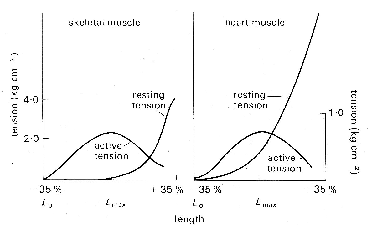 Static mechanical properties of cardiac muscle. The 'sliding filament' description of sarcomere behaviour outlined above is doubly compelling because it not only fits with the visible ultra-structure of muscle, but offers an explanation of one of its fundamental mechanical properties - the length-tension relationship. When a muscle is held at a constant length and stimulated electrically it generates tension (active or developed tension) over and above any resting tension present prior to stimulation. If this experiment is repeated with successive small increments in length, the active tension is found to increase successively to a peak and then decline (Fig. 11.9).