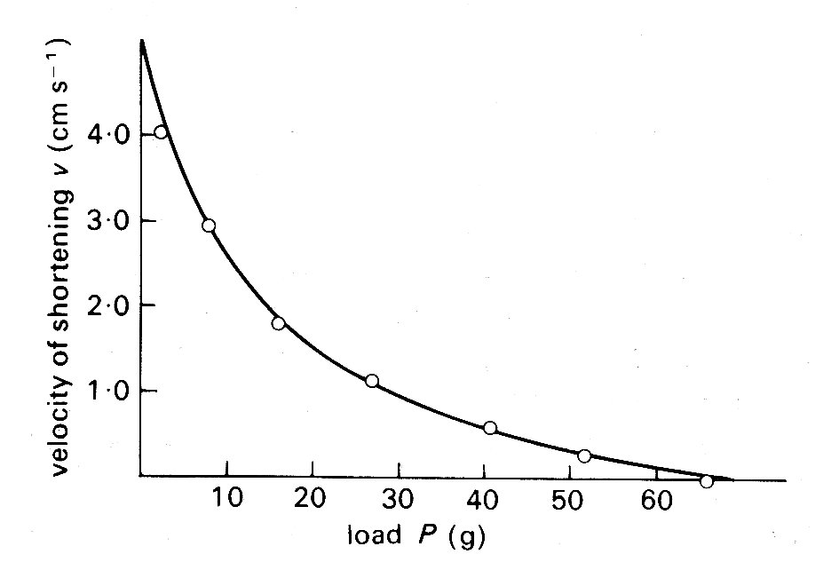 The explanation of this liberation of excess heat on shortening came some years later when instruments capable of following heat-production instant by instant through the contraction and relaxation cycle became available. It was then shown in a famous series of experiments carried out by A. V. Hill that the extra heat associated with shortening is proportional to the distance x shortened; thus it is equivalent to ax units of work where the constant a has the dimensions of force. Now the amount of mechanical work done is Px units; so the total extra energy released in shortening is (P + a )x, and the rate of release of energy is (P + a) v, where v (= dx/dt) is the velocity of shortening. This rate of energy liberation was found experimentally to increase as load diminished, having its highest value when the load was zero and being zero when the muscle exerted its maximum force in an isometric contraction. The relationships were found experimentally to fit best in the form