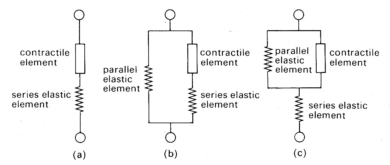The thermal observations were, however, of great importance in another way, since they suggested the first conceptual mechanical model of the muscle fibre. Observations on the course of heat release in the very early stages of stimulation revealed that it was similar for both isometric and isotonic contractions. This suggested that similar mechanical events were occurring in the early stages of both types of contraction, and since the length of the muscle fibre could not change in an isometric contraction, the idea arose of a contractile element in the muscle, which shortened on stimulation but which was linked in series to an elastic element that could lengthen if muscle length was held constant (Fig. 11.11 (a)).