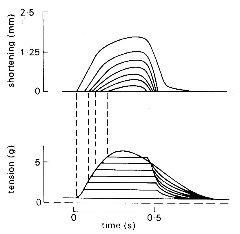 For a given muscle preparation, the tension generated in each twitch or tetanus will increase with increasing stimulus strength until a maximum is reached which is highly reproducible over long periods of time. If the muscle is held at constant length, the twitch or tetanus is known as isometric; if it is allowed to shorten, the force (if any) opposing shortening is described as the load (or afterload) and if this force is constant, which implies that all accelerations of the load are very small compared to that due to gravity, the contraction is called isotonic. Since maximal isometric contractions were found to be highly reproducible, they were used experimentally as the baseline condition; in this case the muscle generated heat during the course of a stimulation cycle, but since no shortening occurred, no external work was done (work, or energy, is equivalent to force times distance). When muscles were allowed to shorten by a distance x against a load or force P, not only were Px units of work done, but an extra amount of heat was released. (This effect of shortening on heat production is known as the 'Fenn effect' after its discoverer; Fenn (an American physiologist who did this work in 1923) also demonstrated the converse to be true - if a muscle was stretched during stimulation, it gave out less heat than when held at constant length. In describing this experiment, Fenn coined a phrase, 'negative work', which has given pain to physical scientists ever since; this is unfortunate, since the implication of the experiment - that the mechanical conditions during contraction control the amount of energy released - is fascinating and appears to have been little explored.)