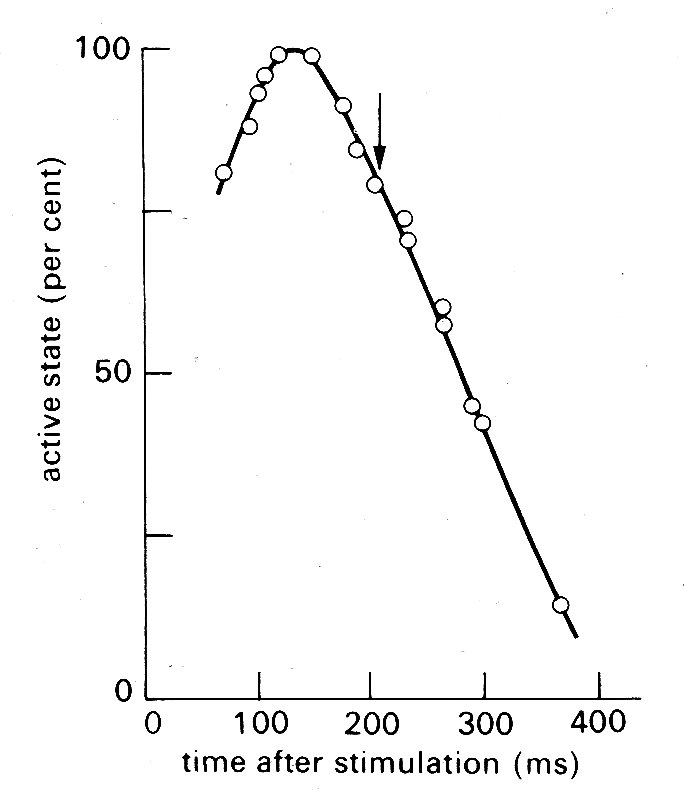 the active state rises to a peak about 150 ms after stimulation (a little before peak tension is reached in an isometric twitch) and then declines steadily.